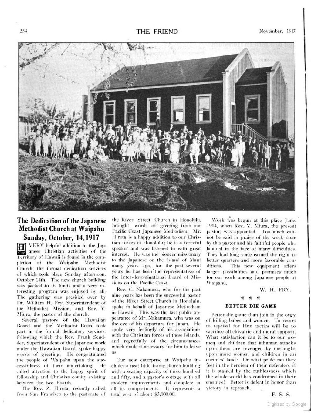 In 1917, Rev. Hirota was reappointed to a church in Honolulu, as pastor and director of the Japanese mission work on the island. He was well received and remembered as the first missionary to the Japanese on Maui many years before. The Friend, a Hawaiian Christian newspaper, wrote at the 1917 dedication of a Japanese Methodist church in Waipahu, “Mr. Hirota is a happy addition to our Christian forces in Honolulu; he is a forceful speaker and was listened to with great interest.”